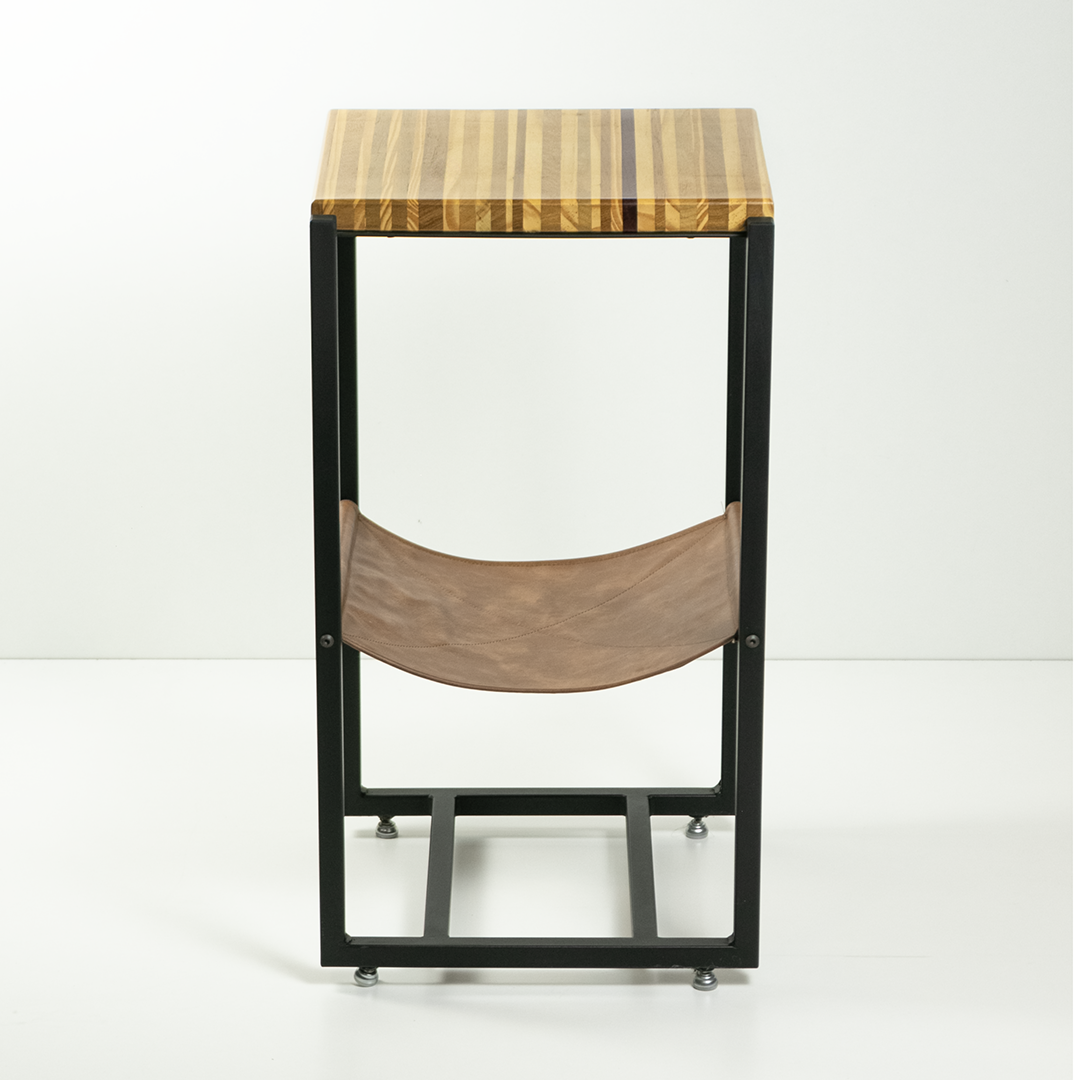 A mesa de apoio Grajaú exalta as matérias-primas e suas diferentes funcionalidades com um design ousado e elegante. O tampo de madeira é feito utilizando a técnica artesanal de marchetaria, um mix de madeiras coladas e prensadas uma a uma, tornando cada peça única por suas variações de tonalidades. A divisória em couro traz um ar de elegância para o seu ambiente, enquanto a estrutura em ferro preto cria um visual ousado.